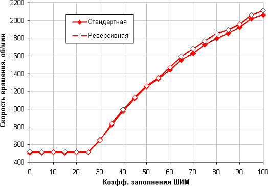 Диапазон регулировки довольно широкий — при изменении КЗ от 25% до 100% скорость вращения плавно растет от примерно 500 до 2050 об/мин. При КЗ 0% вентилятор продолжает вращаться на постоянной минимальной скорости. Это может иметь значение, если пользователь хочет создать гибридную систему охлаждения, которая при низкой нагрузке работает полностью или частично в пассивном режиме.