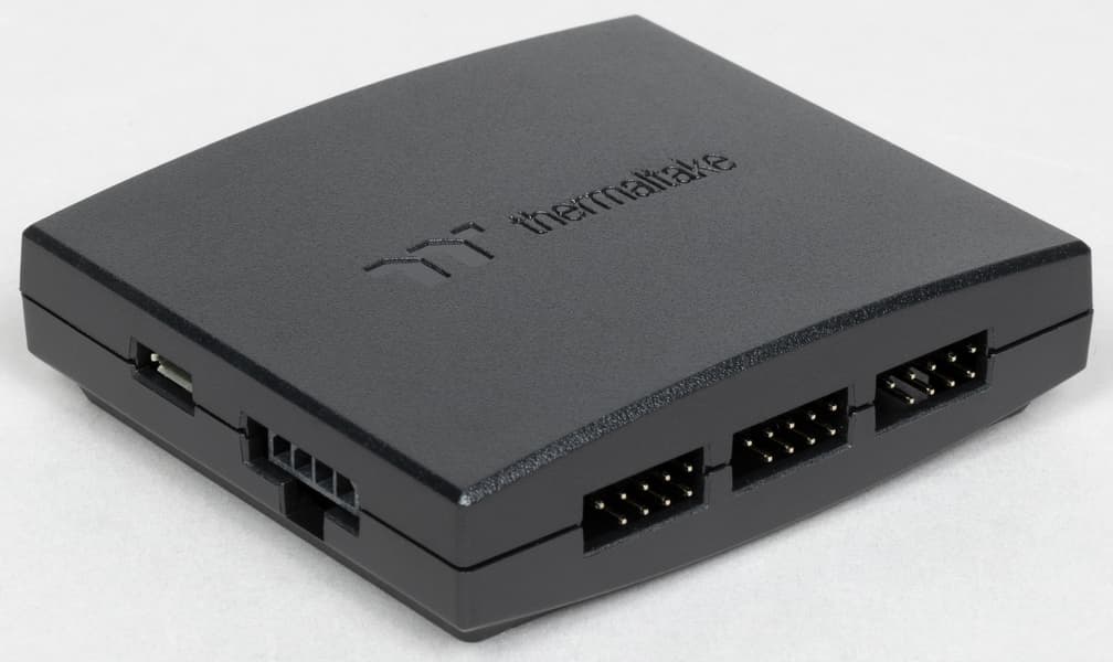 Управление работой вентиляторов и их подсветкой, а также подсветкой водоблоков ряда моделей СЖО и других устройств Thermaltake осуществляется с помощью контроллера. Он представляет собой черную коробочку из пластмассы размером 75×65×20 мм.