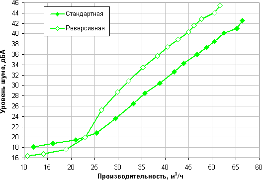 На графике выше: чем ниже и правее находится точка, тем лучше вентилятор — работает тише, дует сильнее. При той же производительности вентилятор с реверсивной крыльчаткой шумит сильнее.
