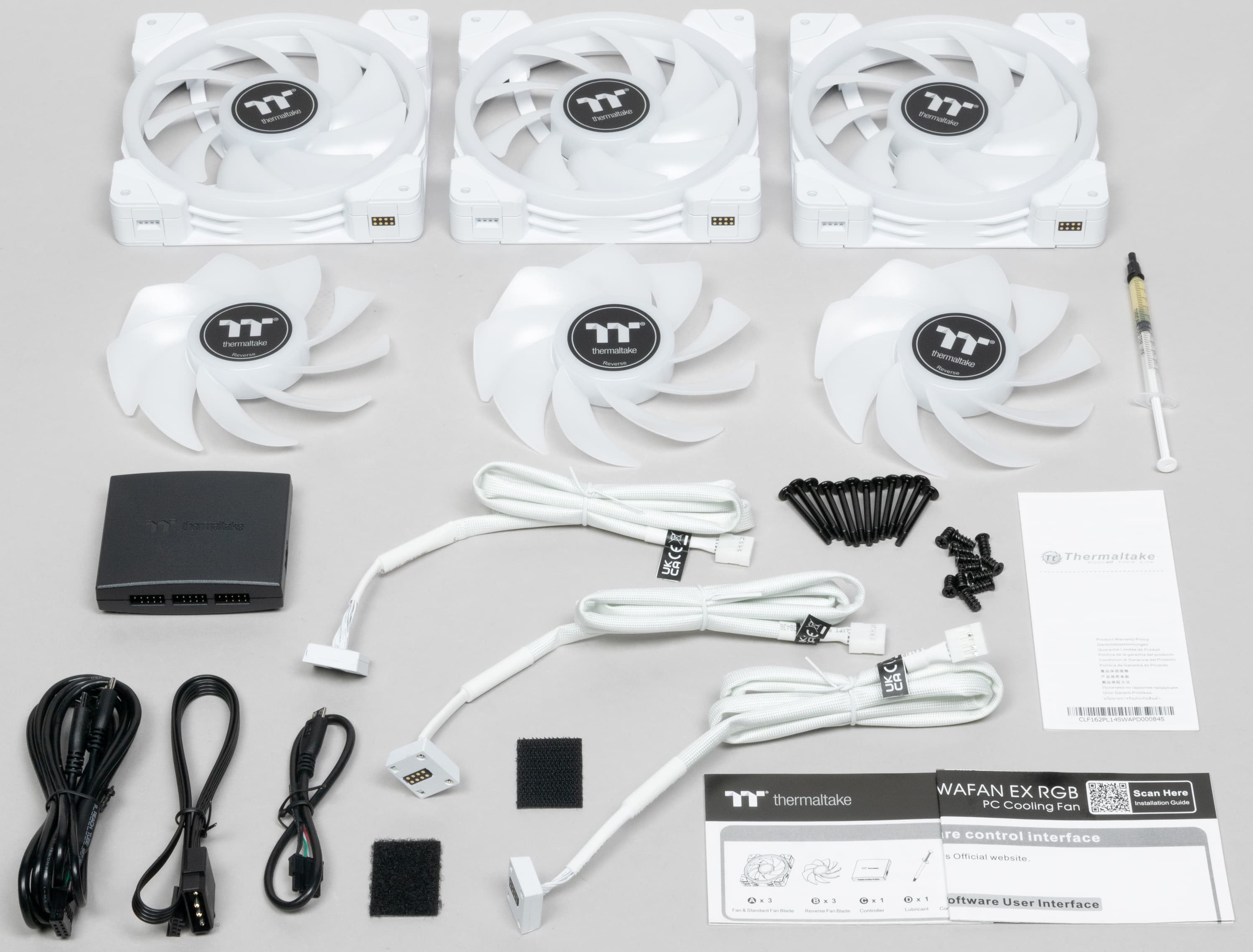 Руководства в виде файла PDF можно загрузить с сайта производителя. Производитель также предлагает аналогичный комплект с черными вентиляторами, а также похожие комплекты с тремя вентиляторами 120 мм, также в варианте черных и белых. Поскольку нет особых оговорок, то нужно считать, что на этот набор вентиляторов предлагается стандартная для вентиляторов Thermaltake двухлетняя гарантия.
