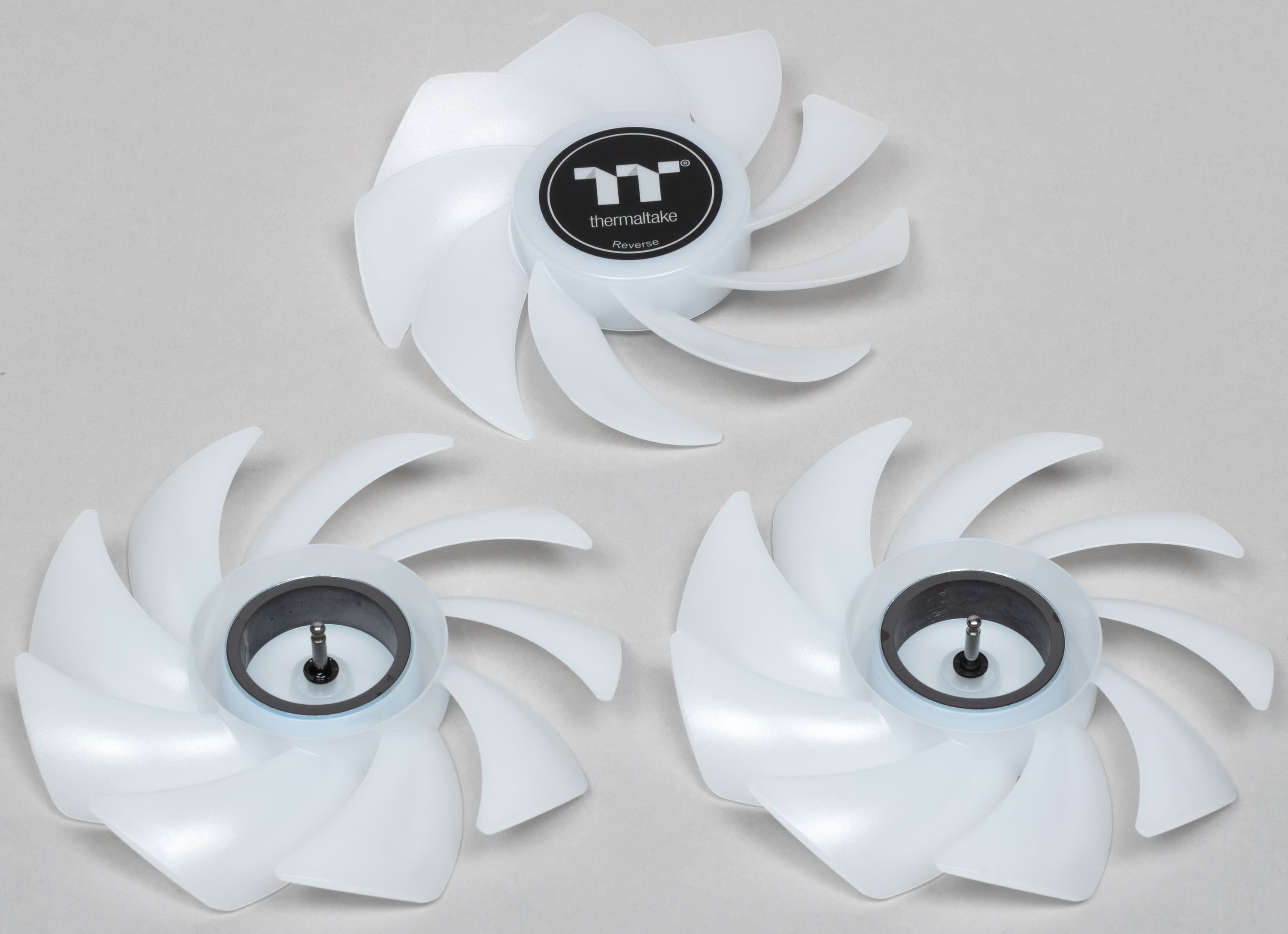 Вентилятор, особенно с подсветкой крыльчатки, смотрится красиво только с фронтальной стороны, в некоторых случаях это слегка портит вид собранного ПК. Компания Thermaltake предложила решение, а именно стала выпускать вентиляторы с дополнительными реверсивными крыльчатками, которые можно установить взамен стандартных. Используя одну из этих двух крыльчаток стандартную или реверсивную, пользователь всегда сможет установить вентилятор так, что он будет смотреться самым выгодным образом.