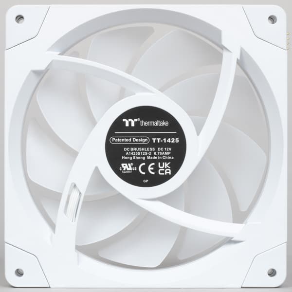 В несжатом состоянии накладки выступают примерно на 0,5 мм. По замыслу разработчиков, это должно обеспечивать виброразвязку вентилятора от места крепления. Однако если прикинуть соотношение массы вентилятора к жесткости накладок, то становится понятно, что резонансная частота конструкции получается очень высокой, то есть практически никакой эффективной виброразвязки быть не может. Кроме того, гнезда, куда вворачиваются крепежные саморезы, являются частью рамки вентилятора, поэтому вибрация от вентилятора будет через саморезы без помех передаваться на то, на чем закреплен вентилятор. В итоге, такую конструкцию проушин можно рассматривать только в качестве элемента дизайна вентилятора. Маркировка на вентиляторе позволяет определить, что используется модель TT-1425 (A1425S12S-2), произведенная компанией Hong Sheng. Впрочем, это общее обозначение нескольких моделей вентиляторов, в лучшем случае оно относится к мотору крыльчатки.