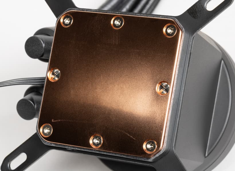 Система герметичная, заправлена, и готова к использованию. Помпа интегрирована в один блок с теплосъемником. Подошвой теплосъемника, непосредственно прилегающей к крышке процессора, служит медная пластина. Ее внешняя поверхность шлифованная и слегка полированная. К центру поверхность выпуклая с перепадом порядка 0,1-0,2 мм.