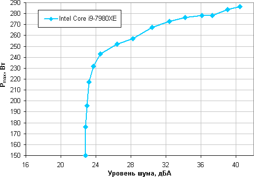 Приняв 25 дБА за критерий условной бесшумности, получим примерную максимальную мощность процессоров, соответствующих этому уровню, это порядка 245 Вт. Гипотетически, если не обращать внимания на уровень шума, пределы мощности можно увеличить еще где-то до 285 Вт. Еще раз уточним, это в жестких условиях обдува радиатора нагретым до 44 градусов воздухом, при снижении температуры воздуха указанные пределы мощности для бесшумной работы и максимальной мощности возрастают.
