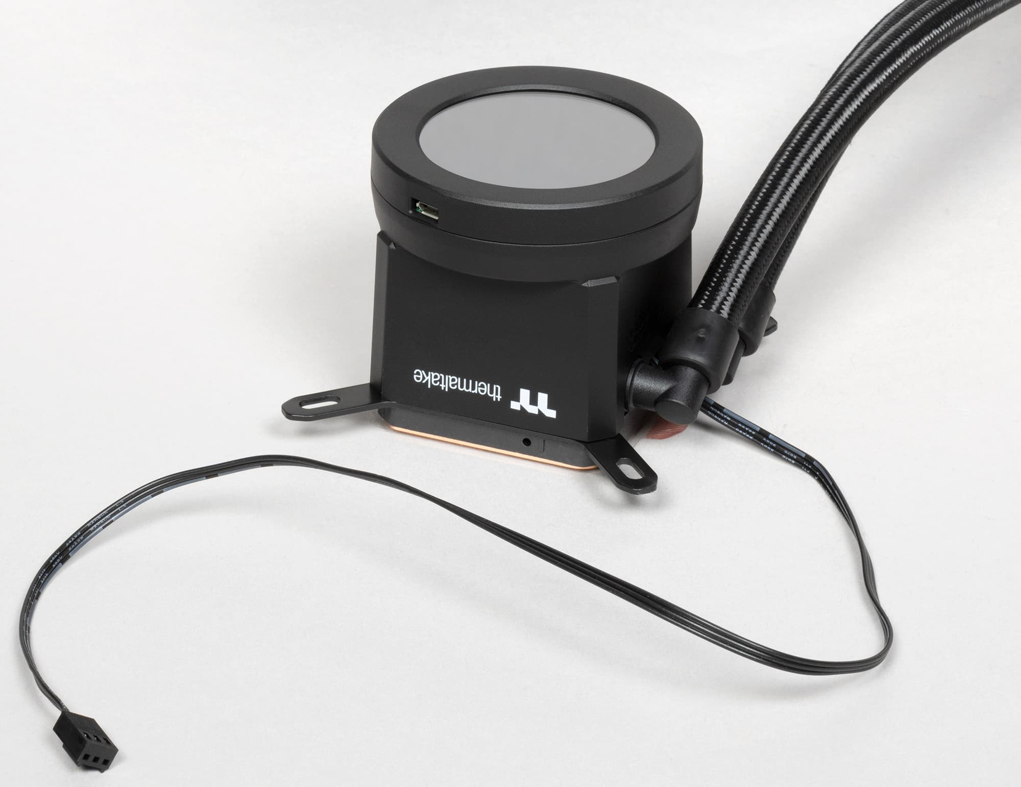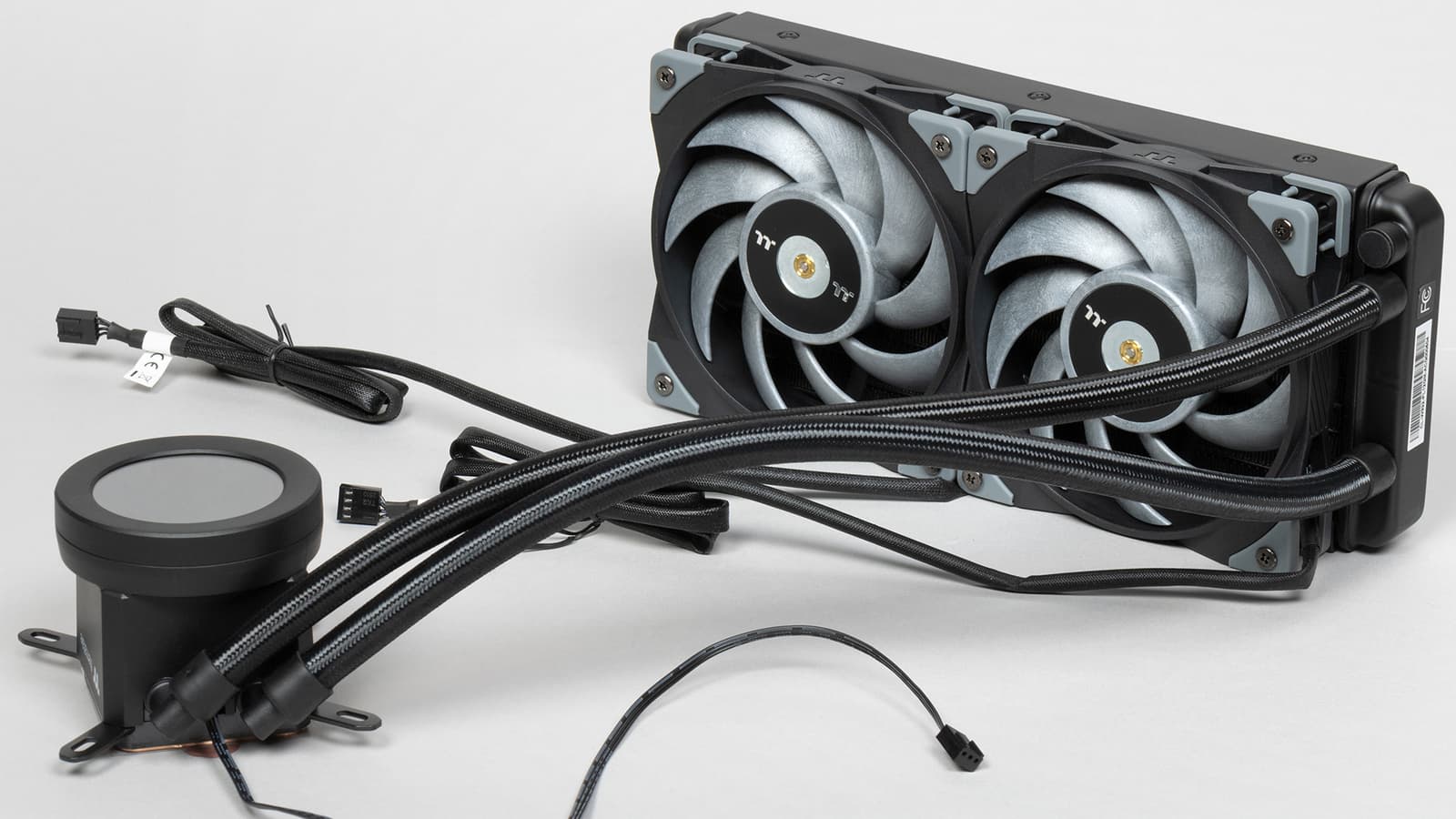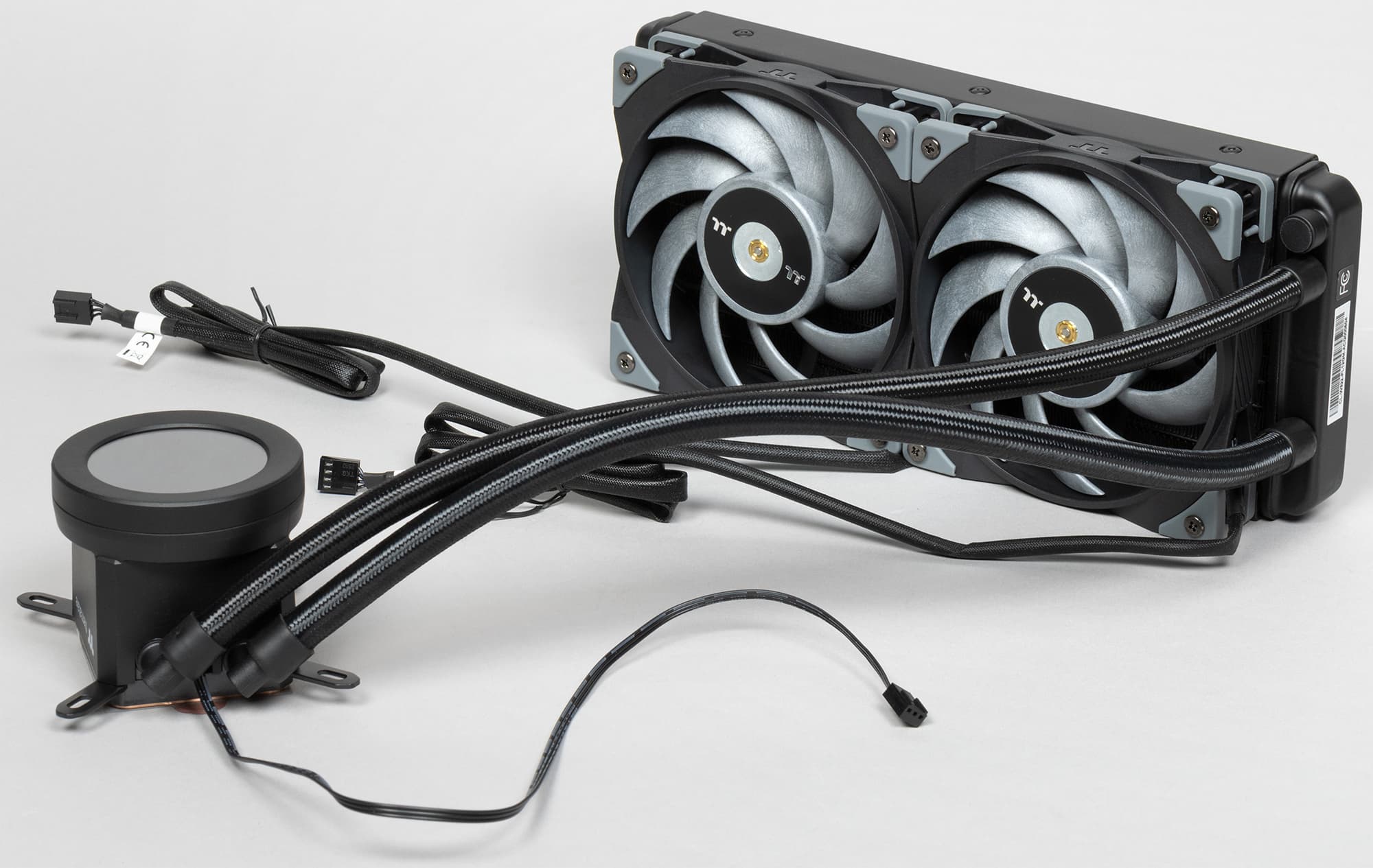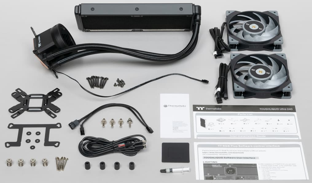 Внутри находятся радиатор с подключенной помпой, вентиляторы, разветвитель, комплект крепежа, термопаста в шприце и кабель для подключения экрана, а также инструкции по установке и к ПО TT RGB Plus, описание гарантии.
