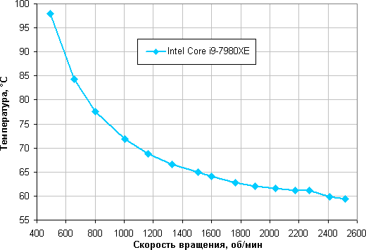 В этом тесте наш процессор с TDP 140 Вт еще не перегревается (при 24 градусов окружающего воздуха) на оборотах вентиляторов, достигаемых с помощью снижения КЗ до 35%, что соответствует примерно 660 об/мин.