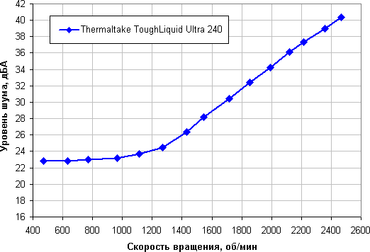 Зависит, конечно, от индивидуальных особенностей и других факторов, но где-то от 40 дБА и выше шум, с нашей точки зрения, очень высокий для настольной системы; от 35 до 40 дБА уровень шума относится к разряду терпимых; ниже 35 дБА шум от системы охлаждения не будет сильно выделяться на фоне типичных небесшумных компонентов ПК — корпусных вентиляторов, вентиляторов на блоке питания и на видеокарте, а также жестких дисков; а где-то ниже 25 дБА кулер можно назвать условно бесшумным. В данном случае охватывается весь диапазон. Шум только от работы помпы равен 22,3 дБА. Работает помпа тихо, поэтому нет особого смысла снижать шум, уменьшая напряжение питания помпы. Фоновый уровень был равен 16,0 дБА (условное значение, которое показывает шумомер).
