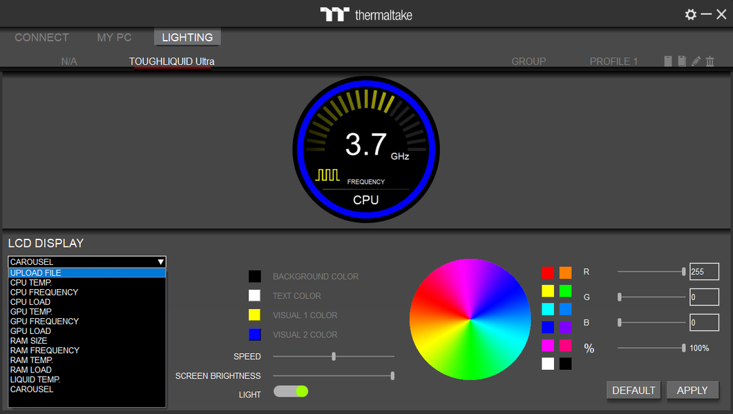 Когда экран на помпе подключен по USB и ПО TT RGB Plus запущено, то на экран выводится то, что задал пользователь. А именно одно значение или несколько сменяемых по циклу (режим карусель) значений параметров ПК.