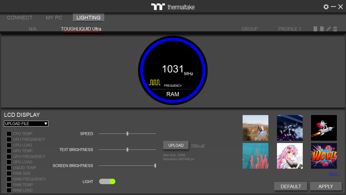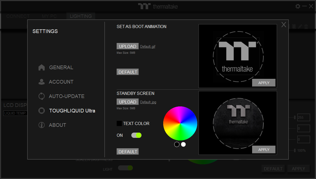 Просто при подаче питания на экран на нем сначала выводится анимированная заставка, которая сменяется изображением, поверх которого может выводиться температура охлаждающей жидкости. Эту заставку и изображение может выбирать пользователь на странице настроек для ToughLiquid Ultra в программе TT RGB Plus.