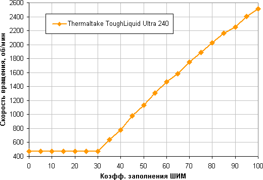Диапазон регулировки скорости вращения широкий, есть плавный близкий к линейному рост скорости вращения при изменении коэффициента заполнения (КЗ) от 30% до 100%. Отметим, что при КЗ 0% вентиляторы не останавливаются, что может иметь значение в гибридной системе охлаждения с пассивным режимом на минимальной нагрузке.