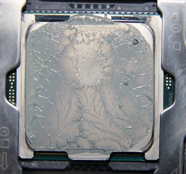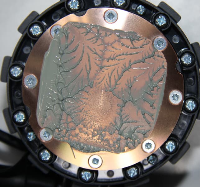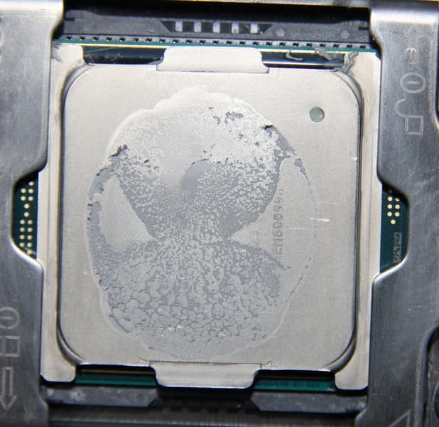 По размеру кружка и распределению термопасты видно, что слой термопасты относительно толстый и нет области плотного контакта. Для оценки того, как это повлияло на эффективность работы системы, в следующих тестах использовалась термопаста другого производителя, расфасованная в шприц и более жидкая. Вот ее распределение на процессоре:
