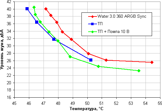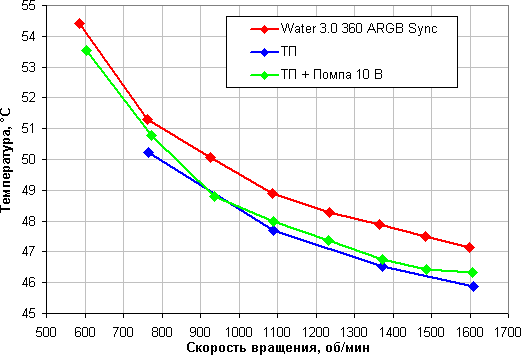На данном рисунке график, подписанный как «ТП», получен при использовании термопасты другого производителя, а график, подписанный как «ТП + Помпа 10 В», получен при использовании термопасты другого производителя и при снижении напряжения питания помпы до 10 В.