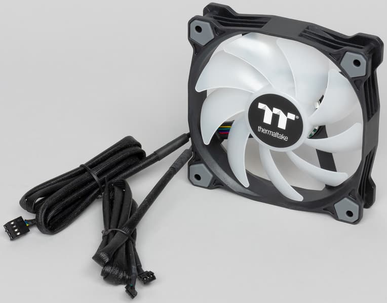 Высота рамки вентилятора 25,5 мм (27 мм высота по накладкам). Габариты рамки — 120 на 120 мм. Масса вентилятора с кабелями 171 г. Кабели от вентилятора заключены в плетеную оболочку. Согласно легенде оболочка уменьшает аэродинамическое сопротивление, но принимая во внимание толщину плоских трех- или четырехпроводных кабелей внутри этой оболочки и ее внешний диаметр, мы в правдивости этой легенды сильно сомневается. Оболочка пропитана каким-то составом, напоминающим каучук, поэтому она относительно жесткая и упругая, и за все цепляется, протаскивать кабель в такой оболочке внутри корпуса занятие не из легких. Впрочем, оболочка позволит сохранить единый стиль оформления внутреннего убранства системного блока. Вентиляторы поддерживают управление с помощью ШИМ. Длина кабеля питания вентилятора составляет 90 см, а длина кабеля подсветки 91 см до первого разъема (вход) и еще 10 см до второго (выход). Кабели длинные, что также расширяет возможности по установке без использования удлинителей. Кабель-разветвитель для питания вентиляторов имеет длину 10,5 см от разъема «мама» до каждого из трех разъемов «папа».