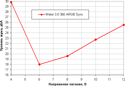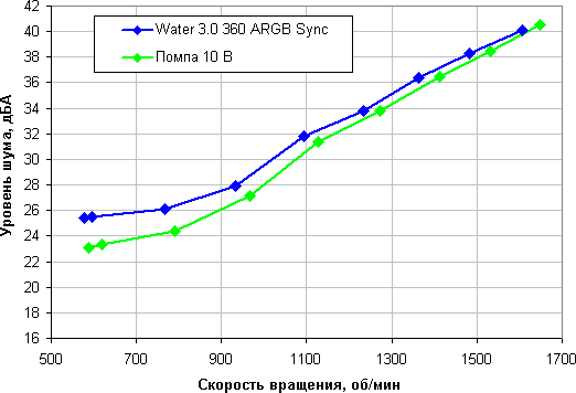 Зависит, конечно, от индивидуальных особенностей и других факторов, но где-то от 40 дБА и выше шум, с нашей точки зрения, очень высокий для настольной системы; от 35 до 40 дБА уровень шума относится к разряду терпимых; ниже 35 дБА шум от системы охлаждения не будет сильно выделяться на фоне типичных небесшумных компонентов ПК — корпусных вентиляторов, вентиляторов на блоке питания и на видеокарте, а также жестких дисков; а где-то ниже 25 дБА кулер можно назвать условно бесшумным. В данном случае охватывается почти весь указанный диапазон, то есть в зависимости от скорости вращения вентиляторов система может быть как шумной, так и очень тихой. Однако даже на минимальной скорости вращения вентиляторов шум от системы немного выше формального порога в 25 дБА. Причина в том, что шум только от работающей помпы при питании от 12 В составил 25,5 дБА. Приведем зависимость уровня шума только помпы от напряжения питания.