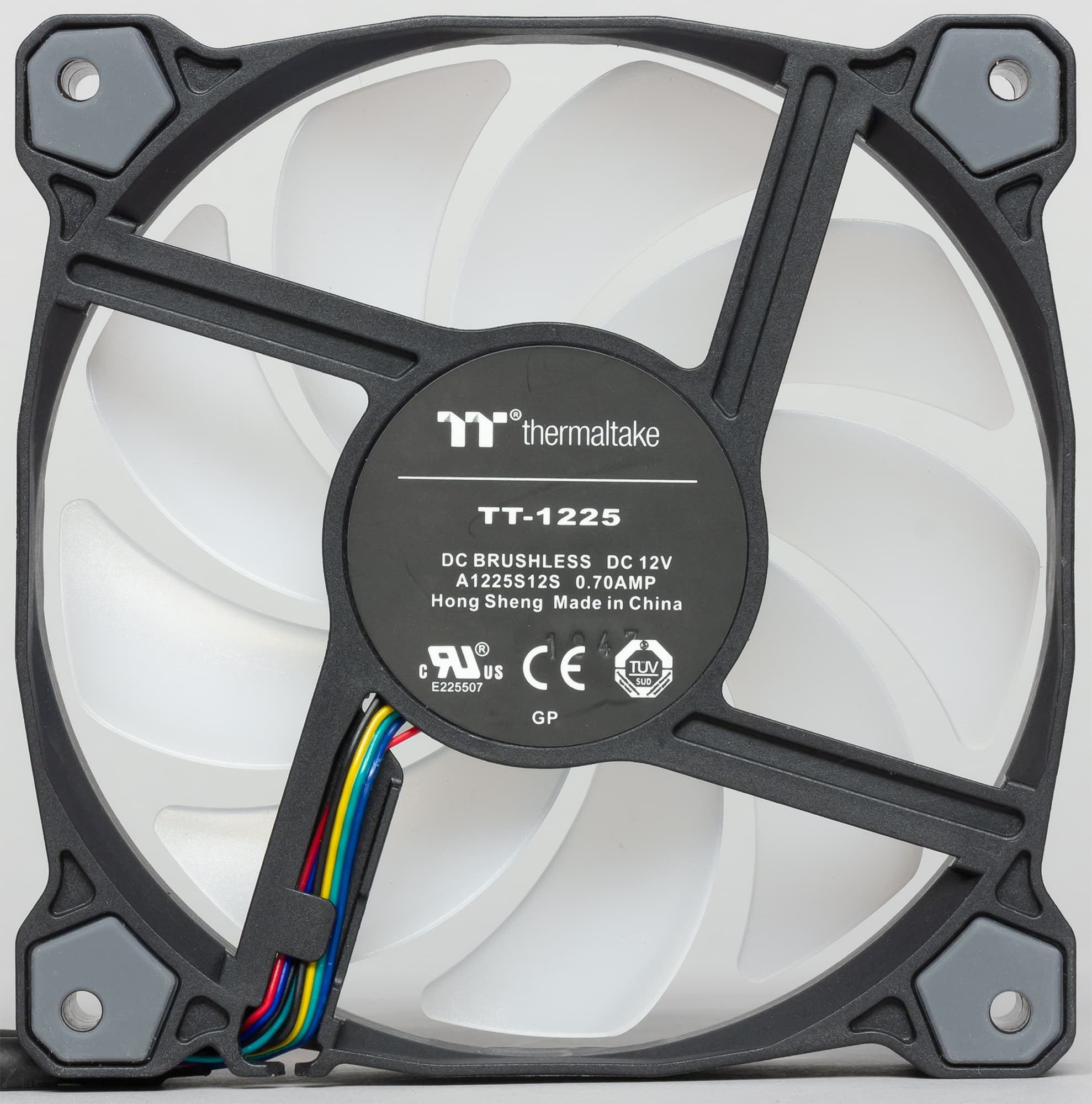 Рамка вентилятора изготовлена из прочного черного пластика, а на проушины рамки наклеена накладки из резины средней жесткости. Накладки выполняют преимущественно декоративную функцию, так как виброизолировать они ничего не могут. Маркировка на вентиляторе позволяет определить, что используется модель TT-1225 (A1225S12S) компании Hong Sheng.