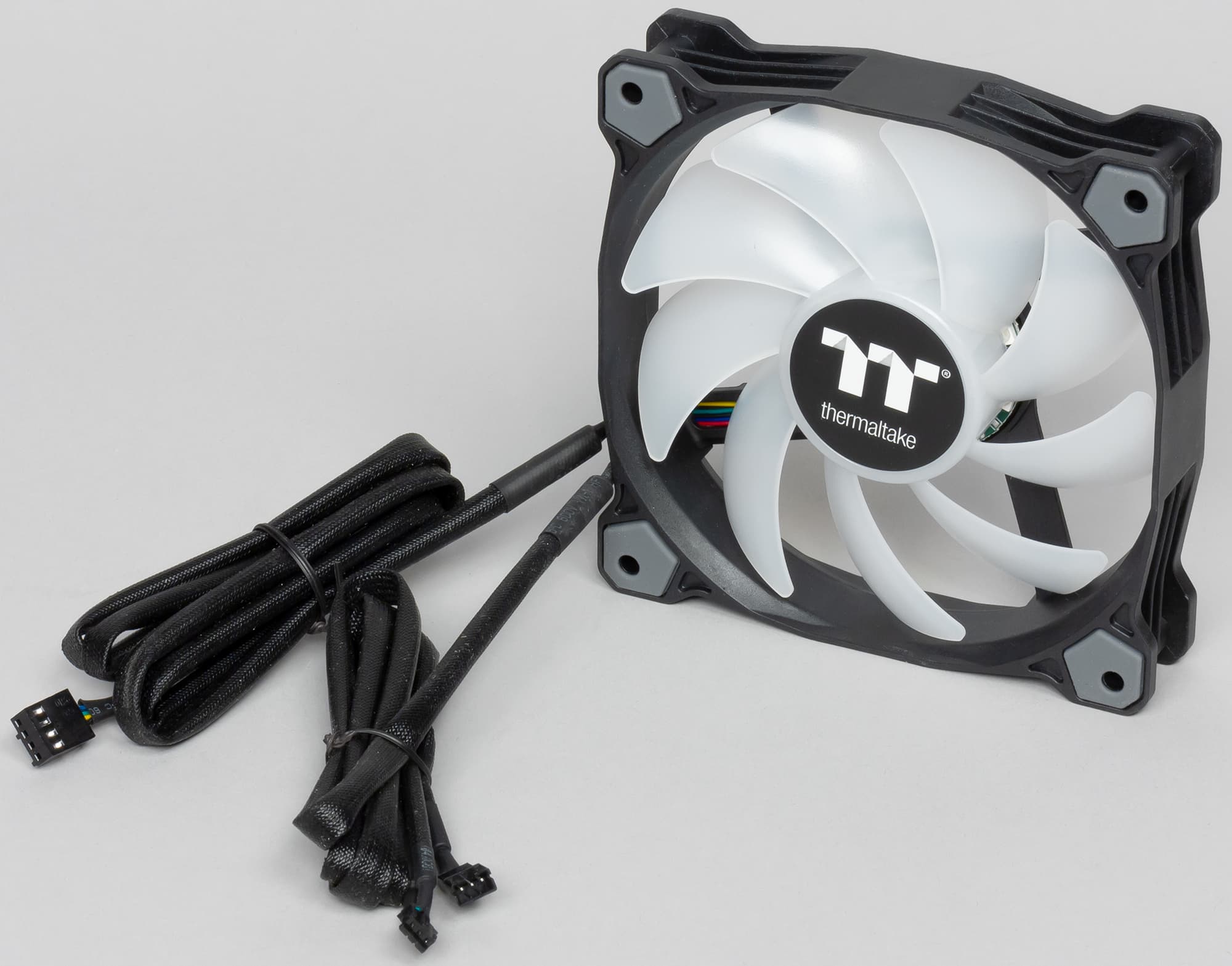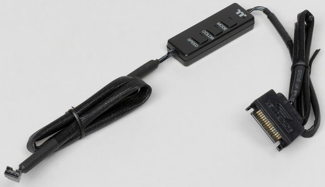 Кабели подсветки вентиляторов и помпы соединяются последовательно: кабель от помпы подключается к проходному разъему первого вентилятора, кабель от этого вентилятора — к проходному разъему второго, тот — к третьему, и последний третий вентилятор подключается к источнику питания для подсветки и управляющего сигнала. Если на материнской плате или на другом контроллере подсветки есть стандартный трехконтактный разъем для подключения ARGB-подсветки, то контроллер подсветки из комплекта можно не использовать, подключив подсветку вентиляторов и помпы через кабель-переходник. Кабель-переходник представлен в двух вариантах: для разъема 5V/D/G и 5V/D/NC/G длиной по 90 см каждый. Комплектный контроллер управляет только работой подсветки.