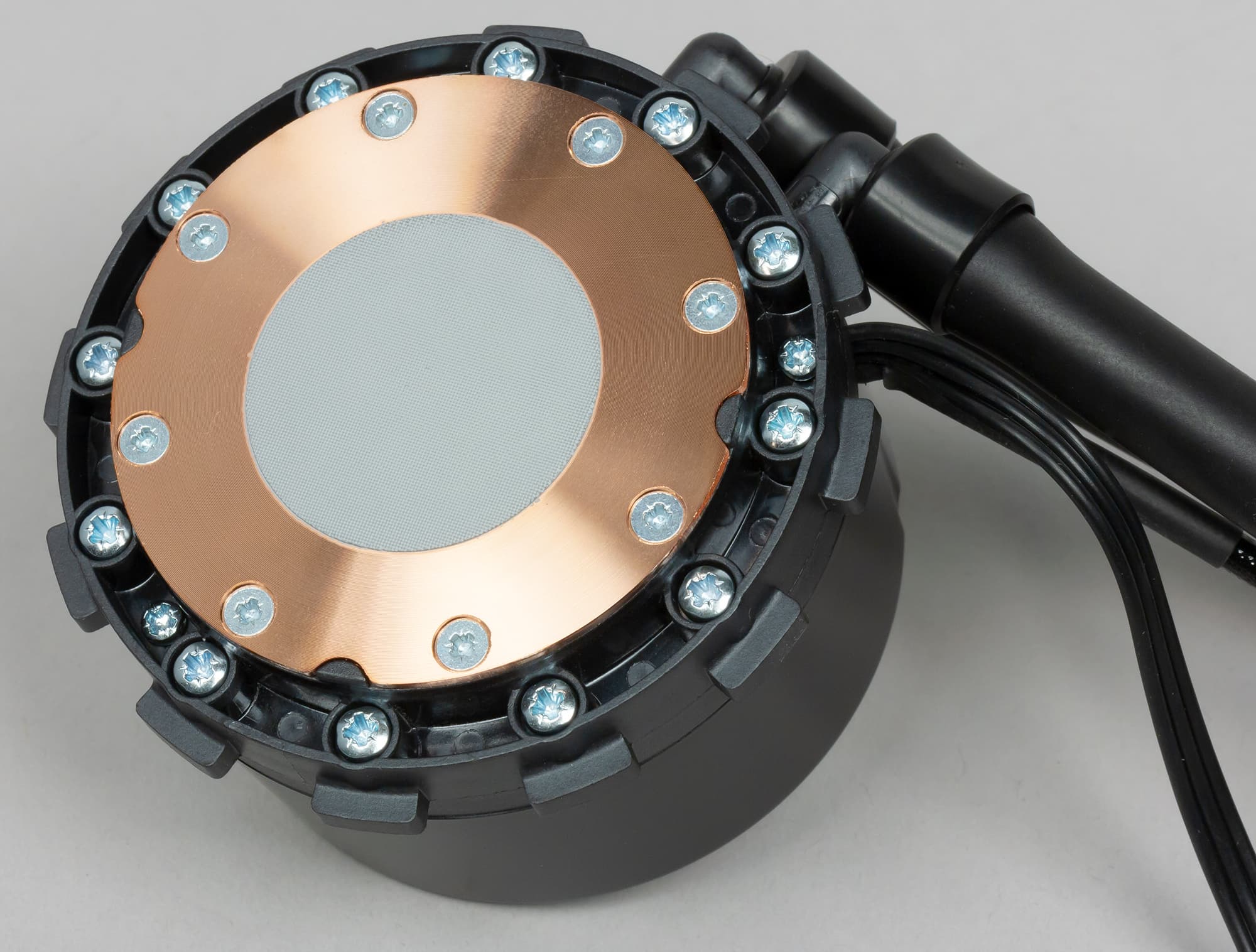 Система герметичная, заправлена, и готова к использованию. Помпа интегрирована в один блок с теплосъемником. Подошвой теплосъемника, непосредственно прилегающей к крышке процессора, служит медная пластина. Ее внешняя поверхность имеет очень мелкую сглаженную концентрическую проточку, как будто она сточена на токарном станке и слегка отполирована. К центру поверхность выпуклая с перепадом порядка 0,2 мм.