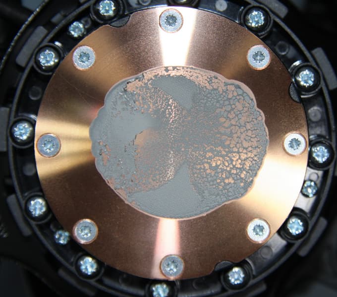 Диаметр этой пластины — 54 мм, а внутренняя часть, ограниченная отверстиями, имеет диаметр примерно 43,5 мм. Центральную часть медного основания занимает нанесенная тонким слоем термопаста. Запаса для ее восстановления в комплекте поставки, к сожалению, нет. Забегая вперед, продемонстрируем распределение этой термопасты после завершения предварительных тестов. На процессоре: