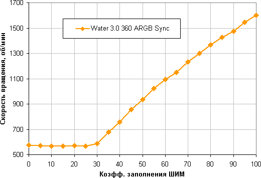 Диапазон регулировки скорости вращения довольно широкий, есть плавный близкий к линейному рост скорости вращения при изменении коэффициента заполнения (КЗ) от 30% до 100%. Отметим, что при КЗ 0% вентиляторы не останавливаются, что может иметь значение в гибридной системе охлаждения с пассивным режимом на минимальной нагрузке.