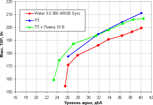 Приняв 25 дБА за критерий условной бесшумности, получим примерную максимальную мощность процессоров, соответствующих этому уровню, это порядка 180 Вт (если помпа работает от 10 В). Гипотетически, если не обращать внимания на уровень шума, пределы мощности можно увеличить еще где-то до 210 Вт. Еще раз уточним, это в жестких условиях обдува радиатора нагретым до 44 градусов воздухом, при снижении температуры воздуха указанные пределы мощности для бесшумной работы и максимальной мощности возрастают. В целом система Thermaltake Water 3.0 360 ARGB Sync является типичной по производительности в своем классе (с радиатором на три вентилятора 120 мм).