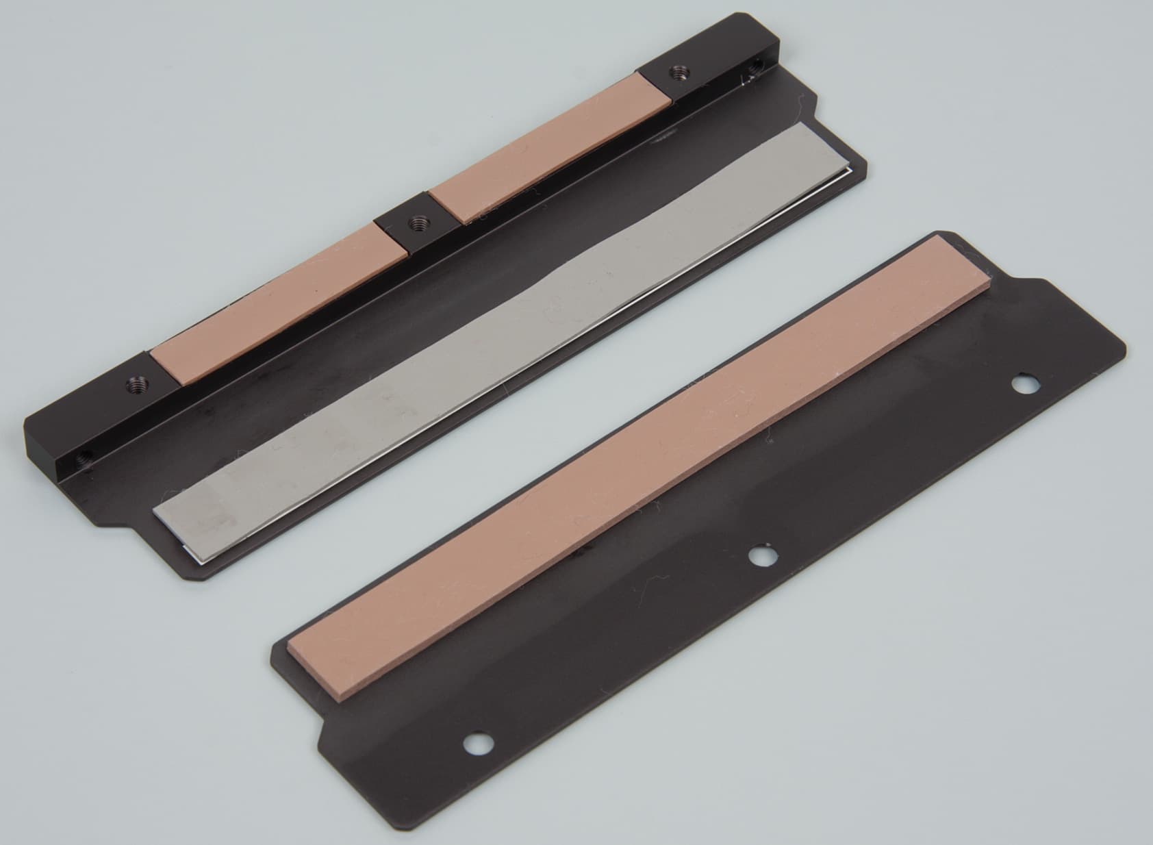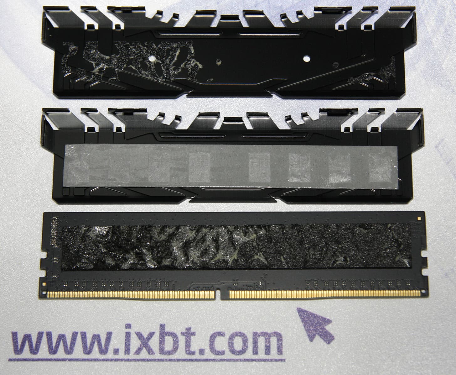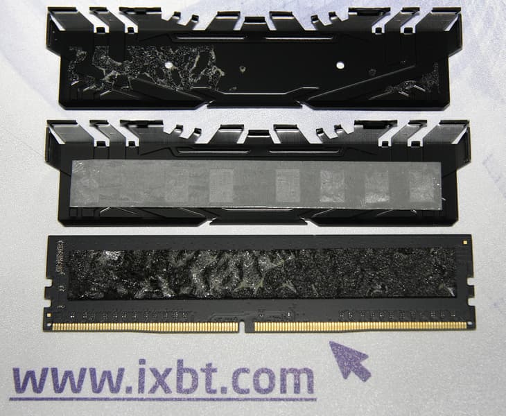 Радиаторы на модулях памяти представляют собой две алюминиевые пластины, анодированные и покрашенные черным, с блестящей полированной фаской по периметру снаружи. Одна пластина просто плоская, а ответная ей — с выступом. Эта вторая прижимается к той стороне планки, где расположены микросхемы памяти. Чтобы улучшить тепловой контакт с поверхностью чипов на этой пластине есть мягкая термопрокладка (серая). Другая пластина контактирует с обратной плоской стороной печатной платы модуля памяти и оснащена красноватой термопрокладкой с немного более высокой жесткостью. Эти пластины стягиваются тремя винтами, прижимающими пластины друг к другу и к планкам памяти. Для улучшения теплового контакта между пластинами вложены тонкие красноватые термопрокладки.