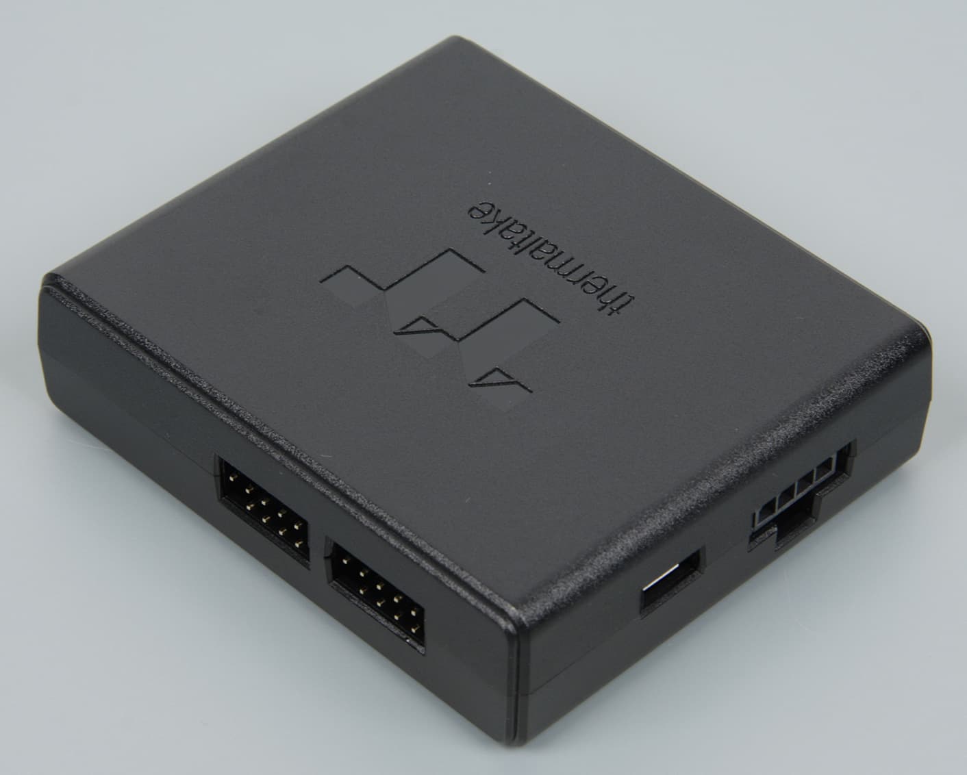 Это стандартный для современных продуктов Thermaltake контроллер, который мы уже встречали в случае наборов вентиляторов с подсветкой и ряда моделей СЖО. Контроллер позволяет управлять подсветкой и работой вентиляторов, а также контролировать скорость вращения вентиляторов.
