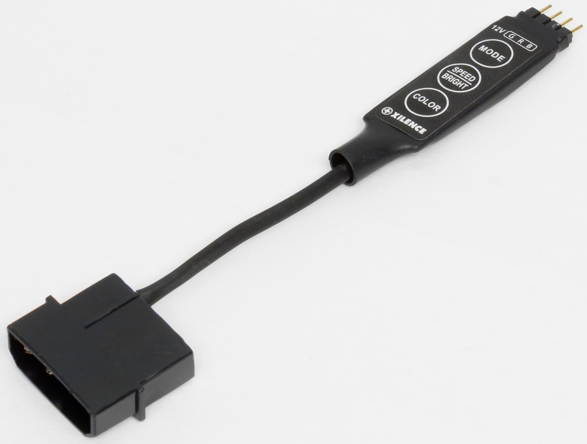 Комплектный контроллер управляет только работой подсветки. Кабель питания контроллера подключается к периферийному разъему («Molex»), что менее удобно, чем к разъему питания SATA. Первая кнопка контроллера переключает цвет статической подсветки, вторая кнопка — яркость статической подсветки или скорость изменения в динамических режимах, третья — динамические режимы.