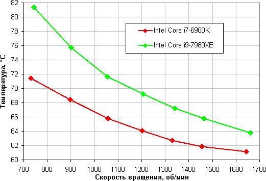 В этом тесте оба процессора не перегреваются даже на минимальной скорости вращения вентилятора, достигаемой с помощью только ШИМ. Однако температура Intel Core i9-7980XE уже близка к критической.