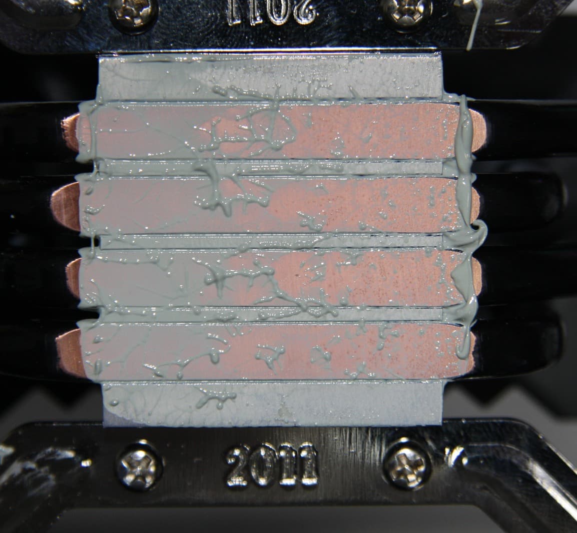 Видно, что термопаста распределилась тонким почти по всей плоскости крышки процессора, а ее избыток выдавился по краям. Очевидно, что в данном случае с термопастой сложно переборщить, так как ее избытки выдавливаются за плоскость подошвы. Пятна плотного контакта находятся на краях теплосъемника, это, конечно, не очень хорошо.