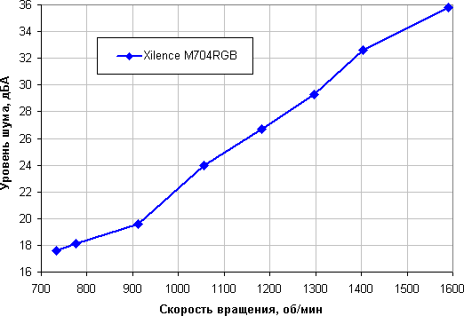 Диапазон регулировки не очень широкий: от 35% до 100% с плавным и близким к линейному ростом скорости вращения. При снижении коэффициента заполнения (КЗ) до 0 вентилятор не останавливается. Это может иметь значение, если пользователь хочет создать гибридную систему охлаждения, которая при низкой нагрузке работает полностью или частично в пассивном режиме.