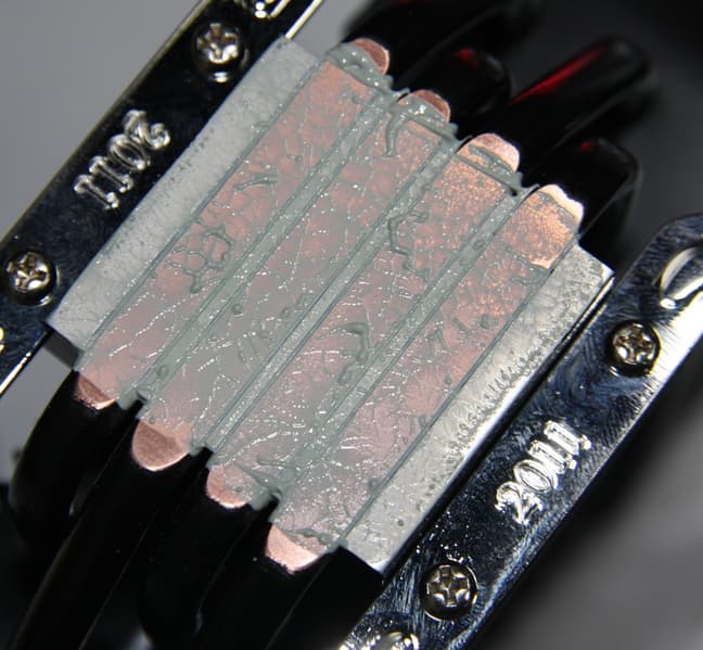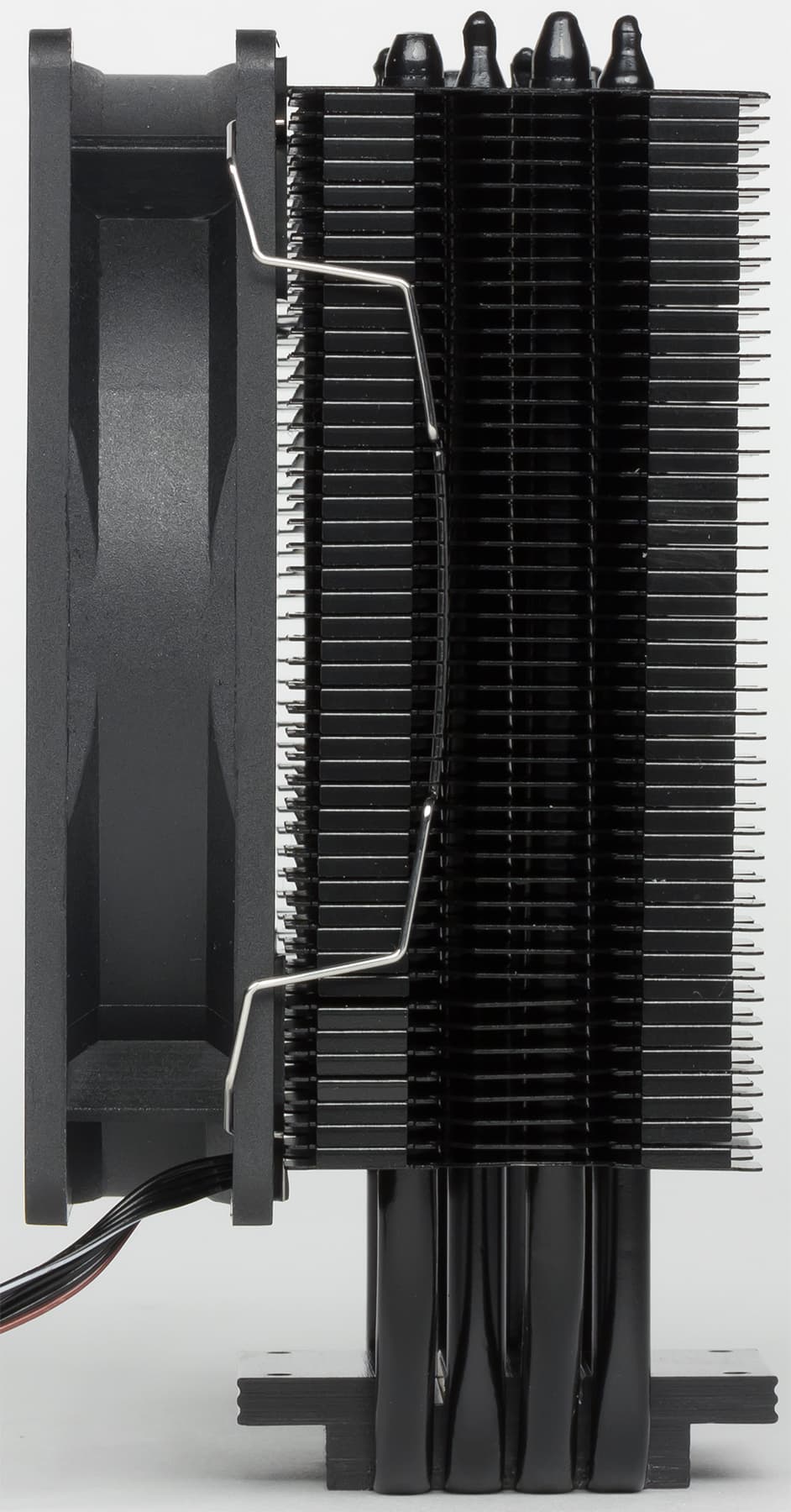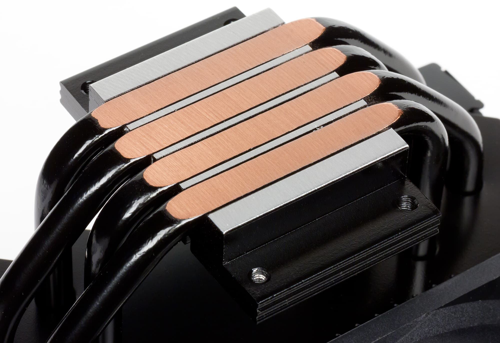 Кулер оснащен вынесенным радиатором, к которому тепло от процессора передается по четырем тепловым трубкам диаметром 6 мм. Трубки, разумеется, медные. У основания теплосъемника трубки сплющены и впрессованы в канавки. Теплосъемник изготовлен из алюминия. Ребра сверху на теплосъемнике в какой-то степени улучшают производительность кулера.