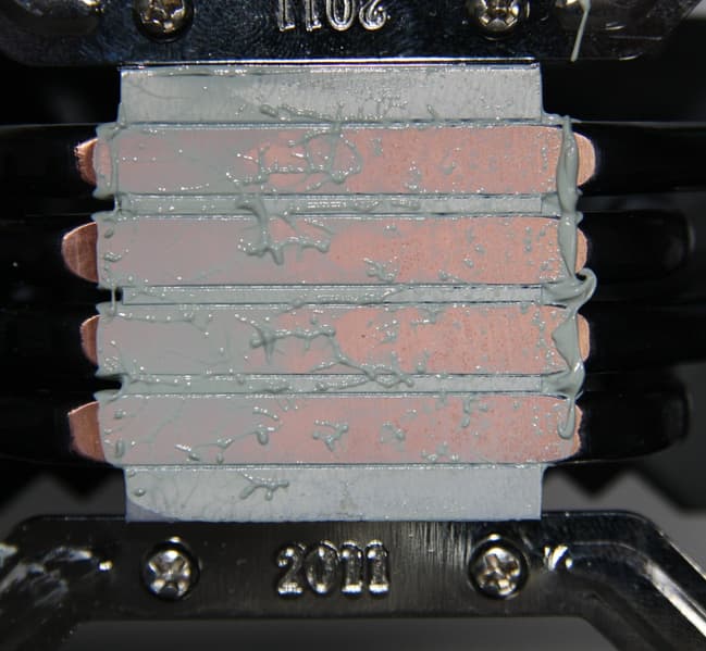 Преднанесенного термоинтерфейса нет, но производитель приложил к кулеру небольшой шприц с термопастой, количества которой хватит на один раз. В тестах использовалась термопаста другого производителя. Забегая вперед, продемонстрируем распределение термопасты после завершения всех тестов. На процессоре: