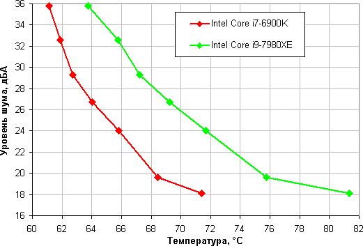 Приняв 25 дБА за критерий условной бесшумности, получим примерную максимальную мощность процессоров, соответствующих этому уровню: порядка 120 Вт для процессора Intel Core i7-6900K и 170 Вт в случае Intel Core i9-7980XE. Гипотетически, если не обращать внимания на уровень шума, пределы мощности можно увеличить еще где-то до 130 Вт и 200 Вт соответственно. Еще раз уточним: это в жестких условиях обдува радиатора нагретым до 44 градусов воздухом; при снижении температуры воздуха указанные пределы мощности для бесшумной работы и максимальной мощности возрастают.