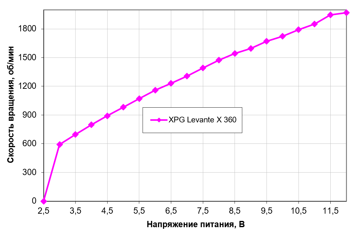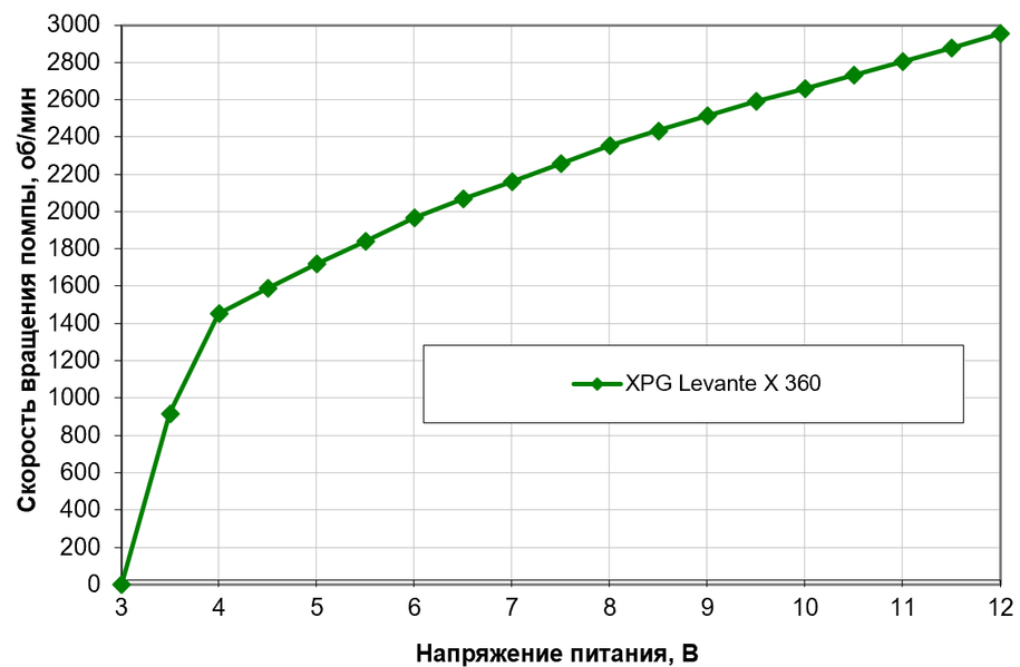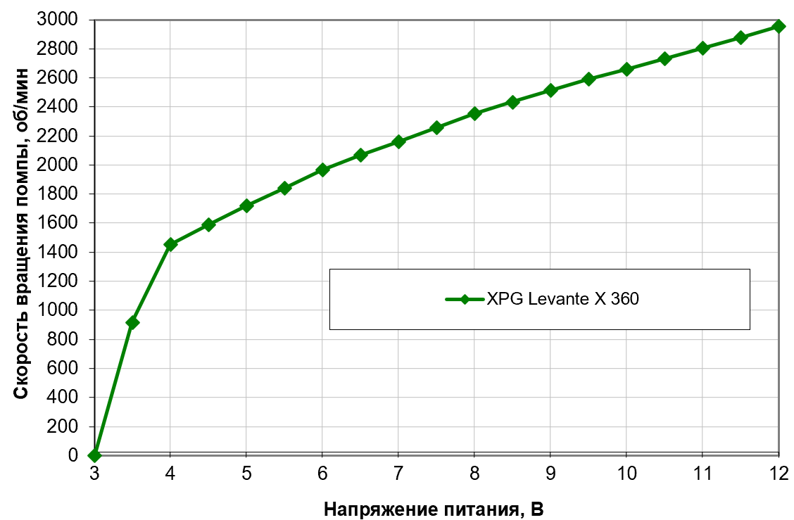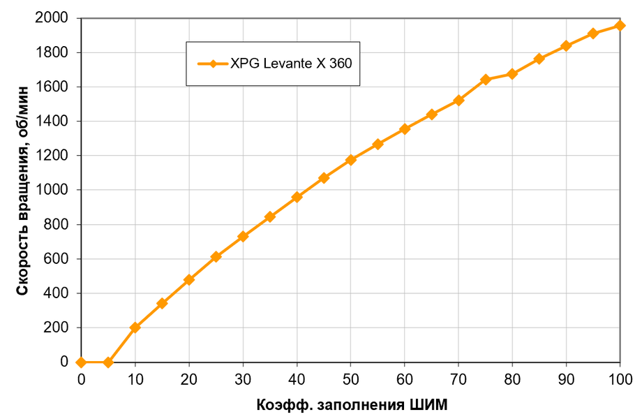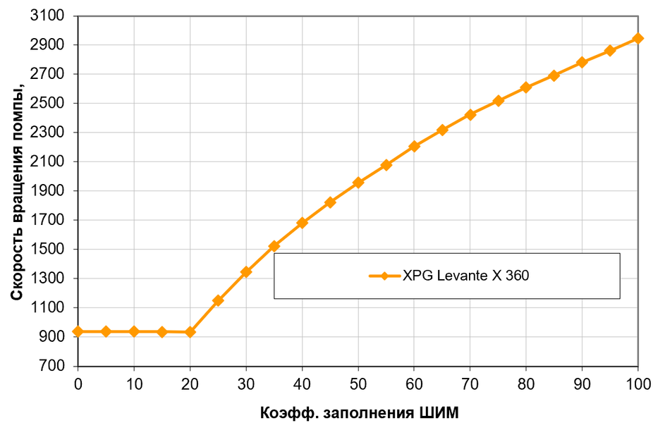 В СЖО XPG Levante X 360 при помощи ШИМ можно управлять и вращением скоростью вращения помпы, но делать это нужно с осторожностью. Считается, что для долгой надежной работы помп с гидродинамическим подшипником скорость вращение крайне нежелательно снижать ниже 50% от максимальной, а лучше вообще держать выше 2/3 максимальных оборотов. Здесь же и половина проходится уже при КЗ 35%, а ниже 20% наблюдается стабилизация на уровне ниже 1/3 от максимума. В принципе, гарантийный срок составляет пять лет, так что в долгой работе своего продукта в XPG явно уверены. Но поработать над настройками, возможно, будет всё равно не лишним.