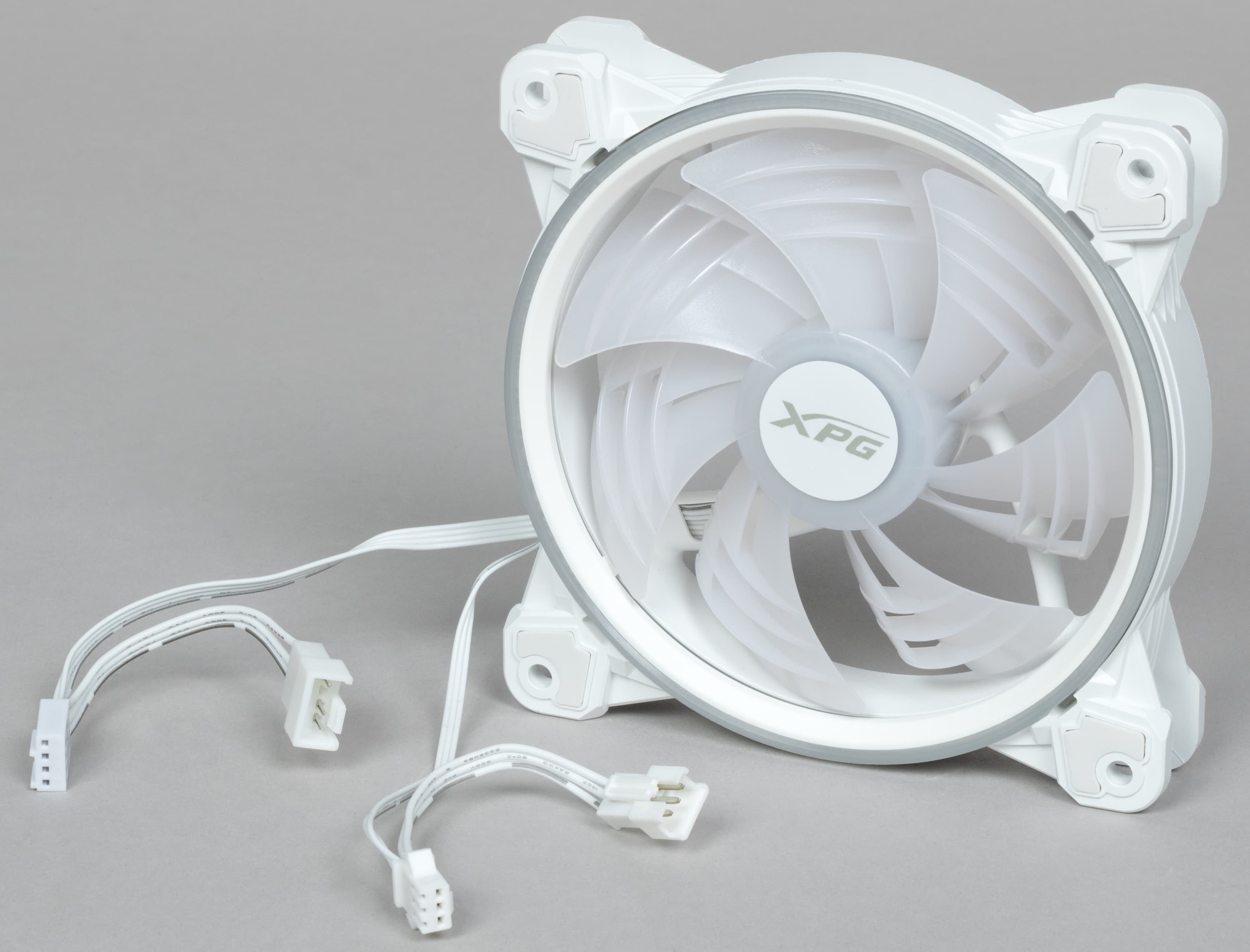 Вентиляторы рассчитаны на соединение цепочкой и синхронизацию управления — благодаря коротким сквозным кабелям питания и подсветки. В этом случае к разъемам на плате или внешнем контроллере подключается специальными удлинителями только крайний. Однако в комплекте есть достаточное количество удлинителей, чтобы независимо подключить всю тройку и управлять каждым по отдельности — при условии, что найдется куда подключать, конечно. Длина каждого удлинителя 45 см, подсветочный также снабжается сквозным разъемом на коротком кабеле.