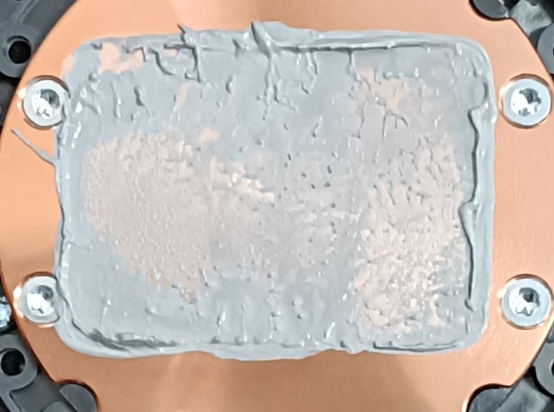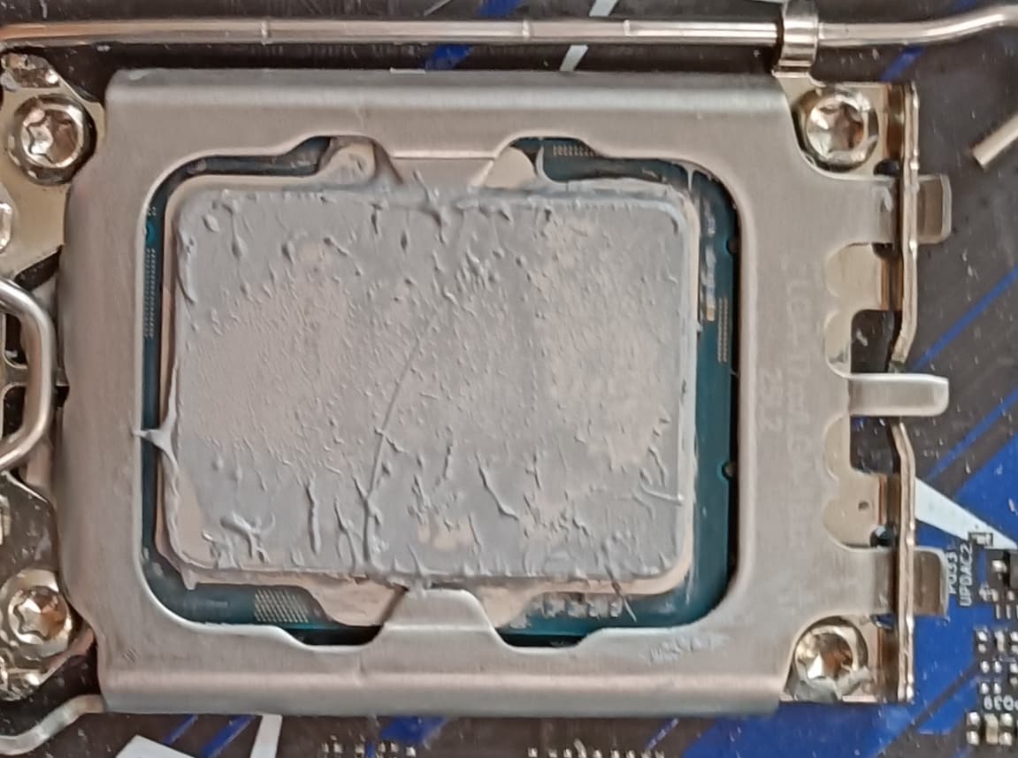 В тестах для унификации мы всегда используем одинаковую качественную термопасту для всех устройств, приобретенную в обычном магазине. Забегая вперед, продемонстрируем ее распределение после завершения всех тестов. На процессоре Intel Core i9-13900K: