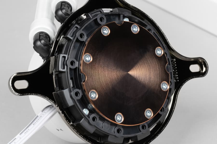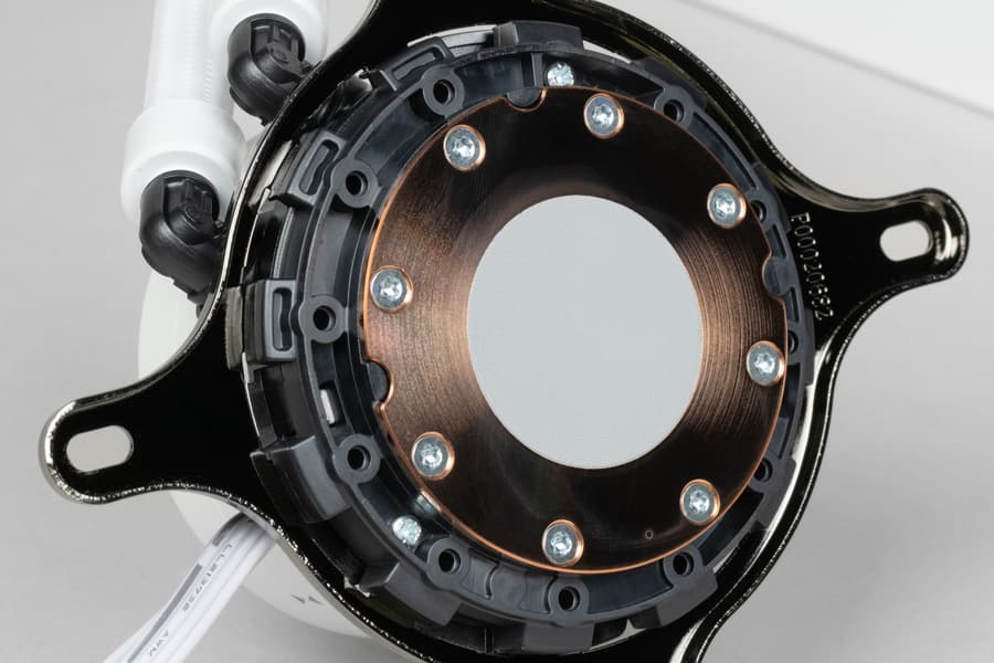 Система герметичная, заправлена, готова к использованию. Помпа интегрирована в один блок с теплосъемником. Подошвой теплосъемника, непосредственно прилегающей к крышке процессора, служит медная пластина. Ее внешняя поверхность ровная, шлифованная и слегка полированная.