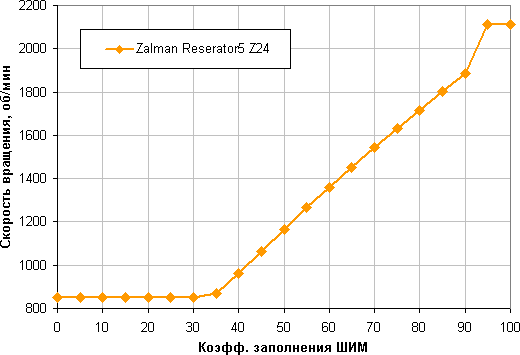 Диапазон регулировки скорости вращения не очень широкий. Есть плавный близкий к линейному рост скорости вращения при изменении коэффициента заполнения (КЗ) от 35% до 95%. При снижении коэффициента заполнения (КЗ) до 0 вентиляторы не останавливаются. Это может иметь значение, если пользователь хочет создать гибридную систему охлаждения, которая при низкой нагрузке работает полностью или частично в пассивном режиме.