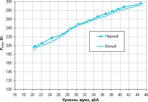 Приняв 25 дБА за критерий условной бесшумности, получим примерную максимальную мощность процессоров, соответствующих этому уровню, это порядка 220 Вт. Если не обращать внимания на уровень шума, пределы мощности можно увеличить еще где-то до 300 Вт. Еще раз уточним, это в жестких условиях обдува радиатора нагретым до 44 градусов воздухом, при снижении температуры воздуха указанные пределы мощности для бесшумной работы и максимальной мощности возрастают.
