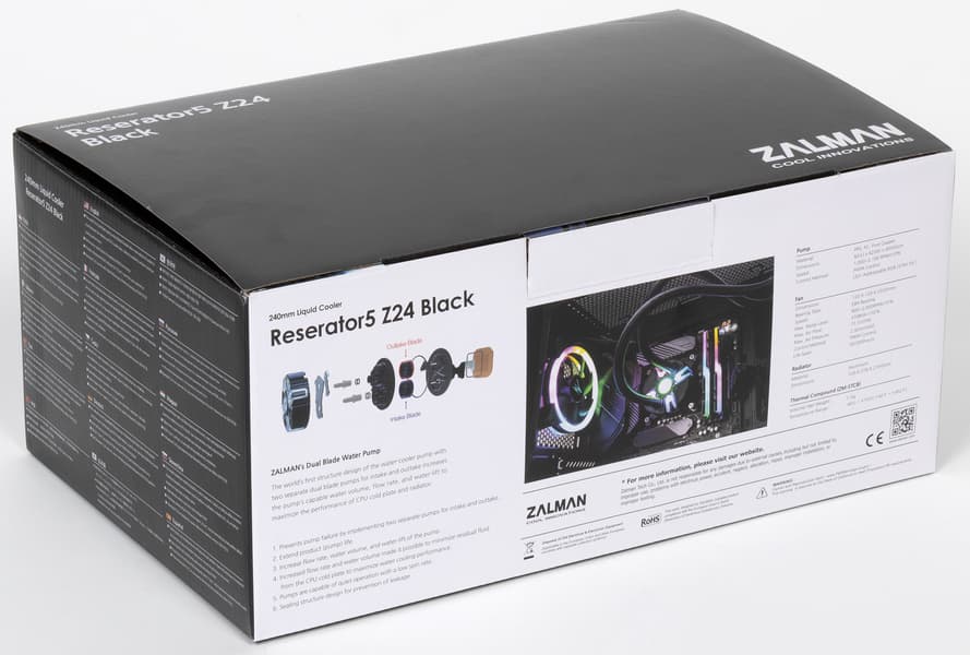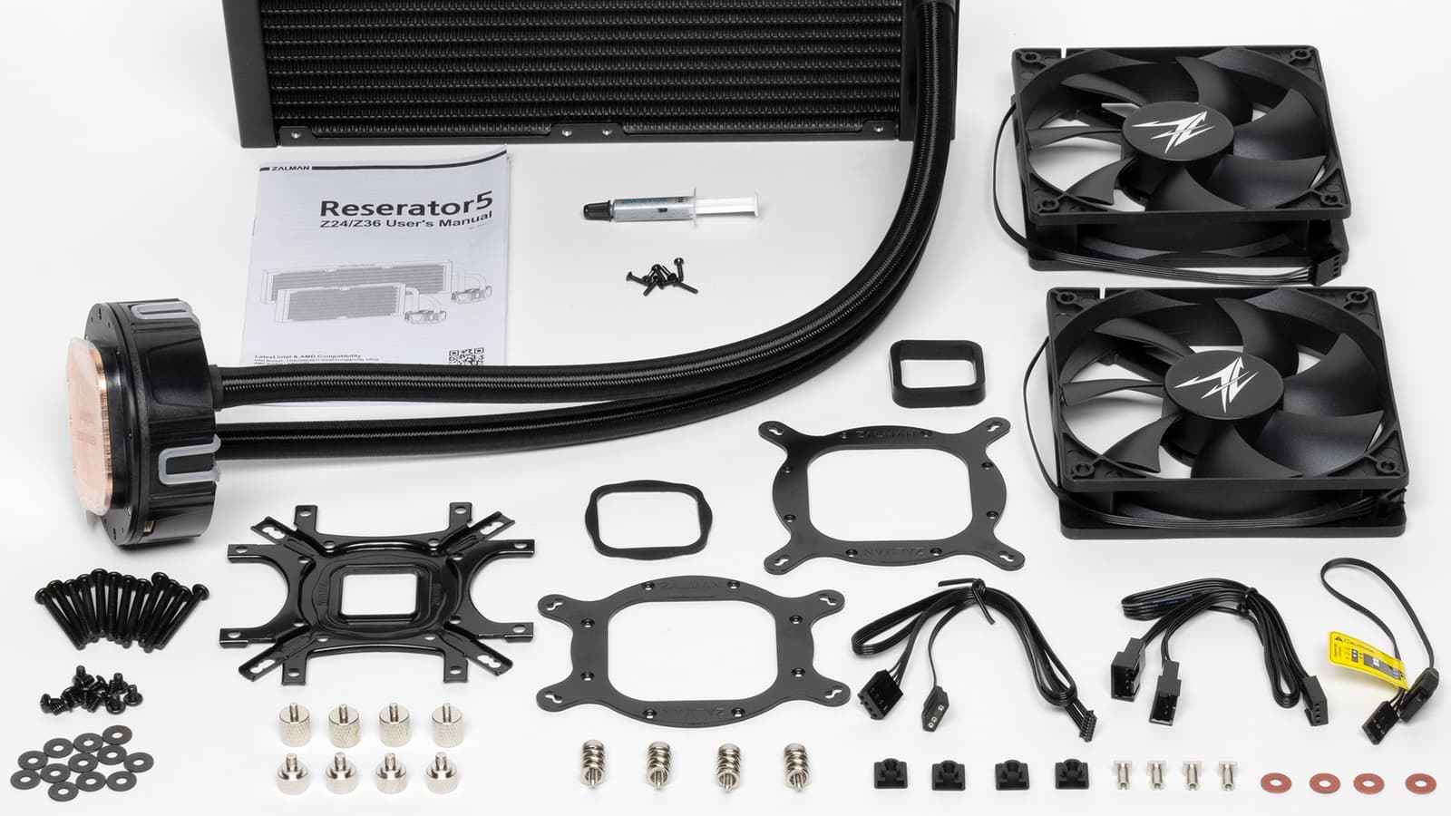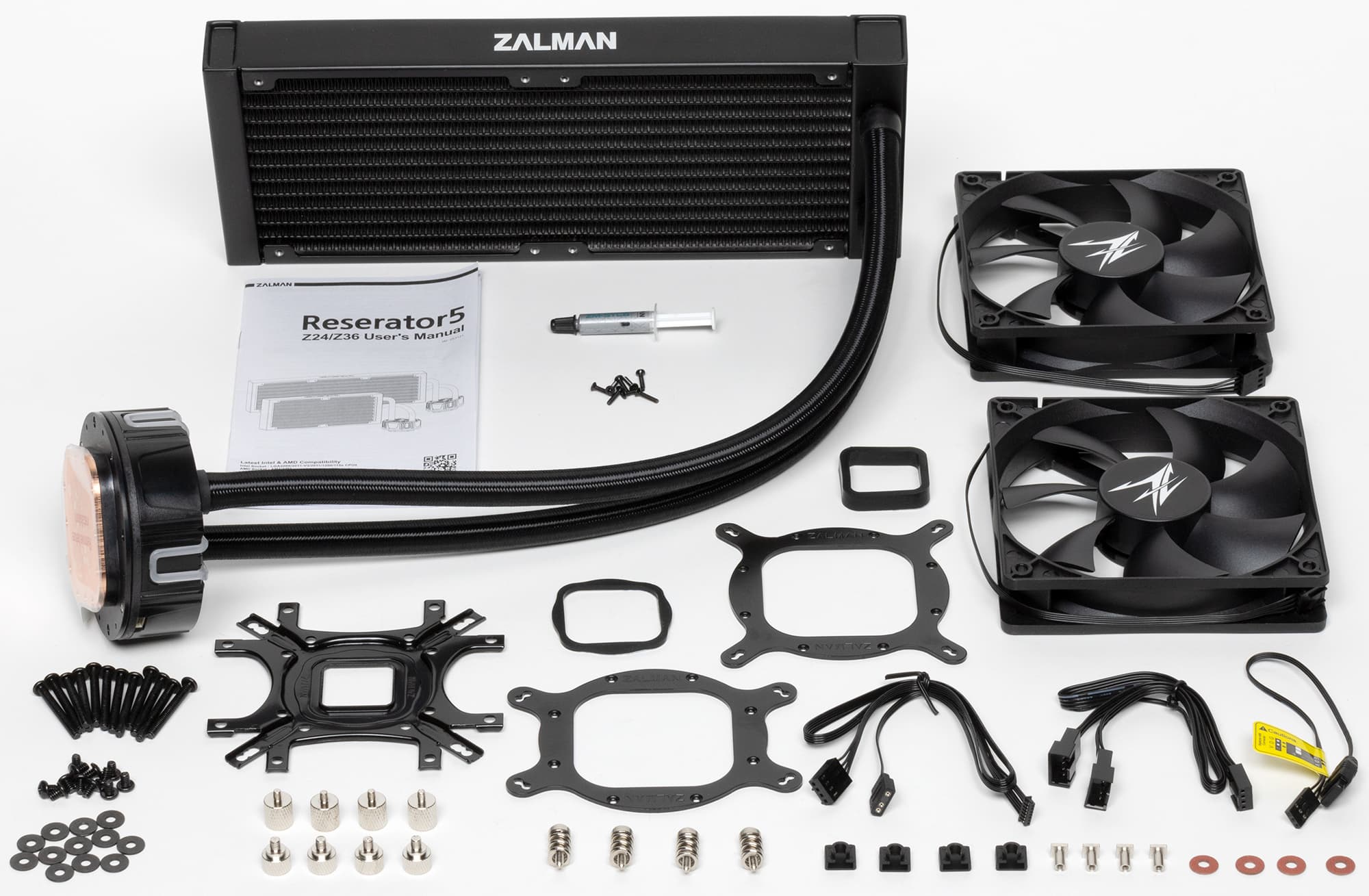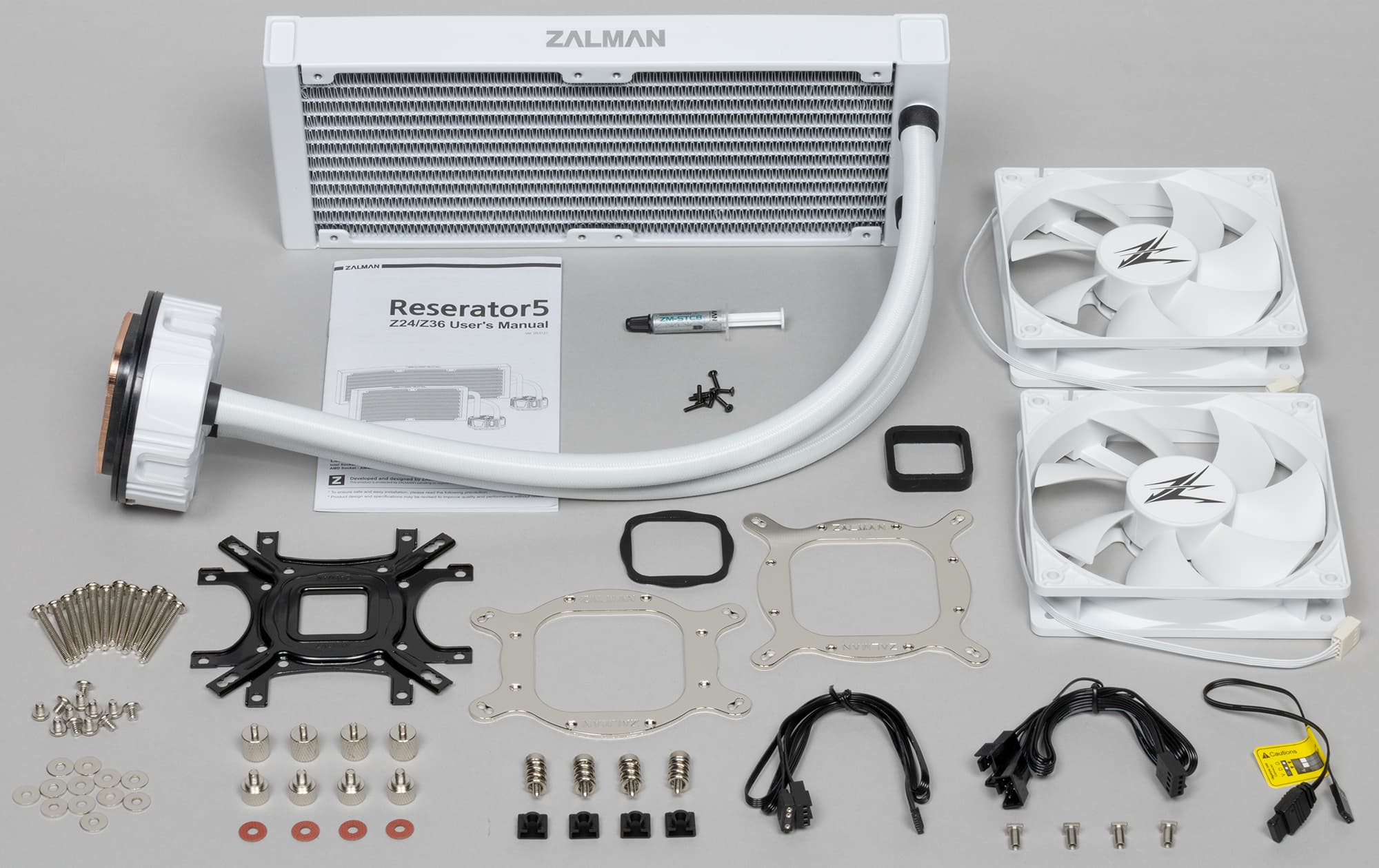 Модель СЖО Zalman Reserator5 Z24 выпускается в двух вариантах — в черном и белом. Фотографии коробки, в которую упакован черный вариант, приведены выше, а ниже показан комплект этого варианта: