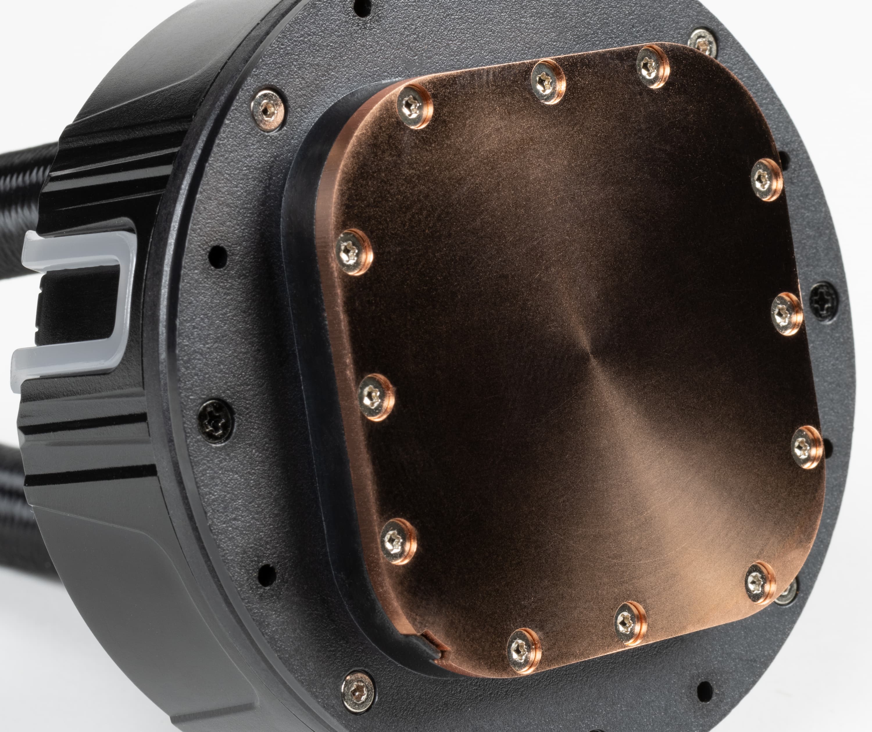 Система герметичная, заправлена, и готова к использованию. Помпа интегрирована в один блок с теплосъемником. Подошвой теплосъемника, непосредственно прилегающей к крышке процессора, служит медная пластина толщиной 2,5 мм. Ее внешняя почти идеально плоская поверхность шлифованная и слегка полированная.