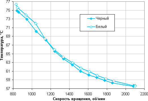 В этом тесте наш процессор с TDP 140 Вт не перегревается (при 24 градусов окружающего воздуха) на оборотах вентиляторов, достигаемых при снижении КЗ до 30%, что соответствует примерно 830 об/мин. Температура в случае белого варианта в среднем была чуть выше, но такая разница вполне укладывается в диапазон погрешности и разброса между экземплярами, не обусловленного именно цветом радиатора.