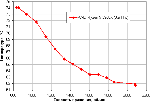 Зависимость температуры процессора при его полной загрузке от скорости вращения вентиляторов: