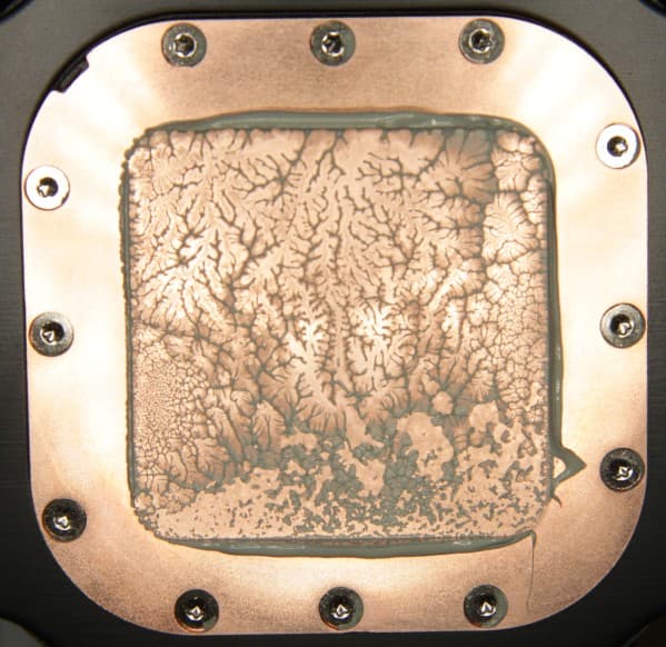 Участок плотного контакта имеет большую площадь. (Распределение термопасты, конечно, немного изменилось при разъединении процессора и помпы.)