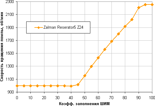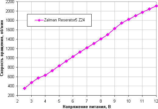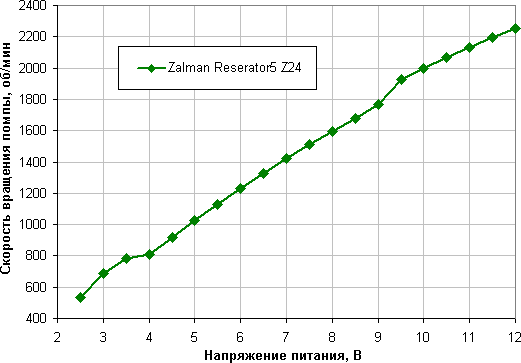 Изменение скорости вращения также плавное, но диапазон регулировки с помощью напряжения намного шире. Вентиляторы останавливаются при 2,0, а при 2,3—2,4 В запускаются. В случае необходимости их допустимо подключать к 5 В. Скорость вращения помпы также можно регулировать с помощью ШИМ и напряжения питания. Приведем соответствующие графики.