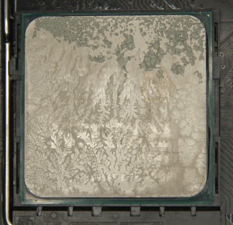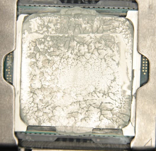 Видно, что термопаста распределилась по всей площади крышки процессора, а примерно по центру есть большой участок плотного контакта. Отметим, что крышка этого процессора сама по себе чуть выпуклая к центру.