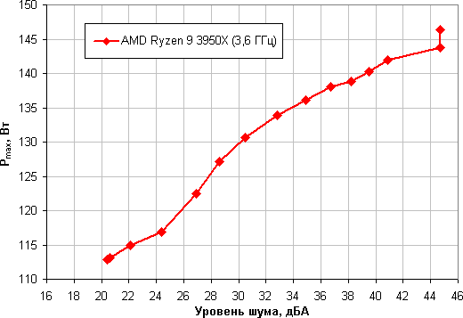 Приняв 25 дБА за критерий условной бесшумности, получим, что максимальная мощность процессора, соответствующая этому уровню, составляет порядка 118 Вт. Если не обращать внимания на уровень шума, то предел мощности можно увеличить где-то до 145 Вт. Еще раз уточним: это в жестких условиях обдува радиатора нагретым до 44 градусов воздухом. При снижении температуры воздуха указанные пределы мощности для бесшумной работы и максимальной мощности возрастают. Результат заметно хуже, чем в случае процессора Intel Core i9-7980XE. Впрочем, при условии достаточно хорошей вентиляции в корпусе данный кулер вполне справится с охлаждением процессора AMD Ryzen 9 3950X, но на возможность существенного разгона рассчитывать уже не стоит.