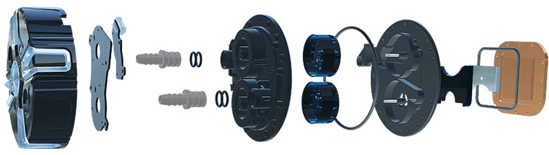 Особенностью помпы является применение двух крыльчаток, приводимых во вращение каждая своим мотором. Одна крыльчатка работает на ввод жидкости в камеру теплообменника, вторая — на вывод. Покомпонентная схема, взятая с сайта производителя, поясняет устройство помпы.