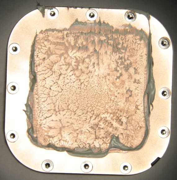 Габариты этой пластины — 56×56 мм, а внутренняя часть, ограниченная отверстиями под винты, имеет размеры примерно 47×47 мм. Термопаста в маленьком шприце, что, конечно, менее удобно, чем преднанесенный слой. Комплектного запаса термопасты должно хватить раза на два в случае процессоров с небольшой площадью крышки и при экономном расходе. В тестах использовалась не менее качественная термопаста другого производителя. Забегая вперед, продемонстрируем распределение термопасты после завершения всех тестов. На процессоре Intel Core i9-7980XE: