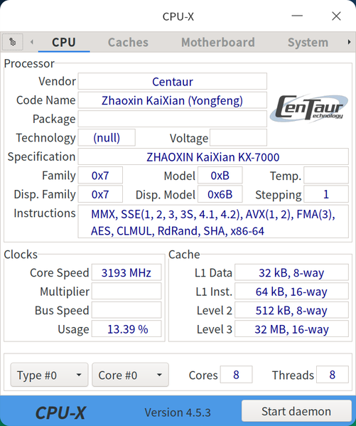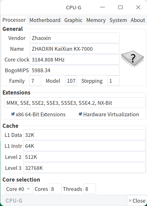 В этом настольном CPU компания смогла реализовать поддержку DDR5 и PCIe 4.0, а вот техпроцесс остался тем же 16 нм — переходу на более современный снова помешали санкции в отношении китайских компаний, запрещающие им доступ к современному полупроводниковому производству. Именно это не дало повысить частоту выше 3,2—3,7 ГГц, чтобы получить более высокую производительность, а также задержало выход решения на рынок. В остальном, по спецификациям KX-7000 неплох, он имеет встроенное графическое ядро ZX-C1190, поддерживающее DirectX 12, OpenGL 4.6 и OpenCL 1.2, аппаратное кодирование и декодирование видеоданных в 4K-разрешении и распространенных форматах H.265/H.264, и способное выводить 4K-изображение по разъемам DisplayPort, HDMI и VGA. Поддерживаются китайские национальные стандарты аппаратного шифрования SM2, SM3 и SM4, а также расширенные наборы инструкций SSE4.2, AVX, AVX2.